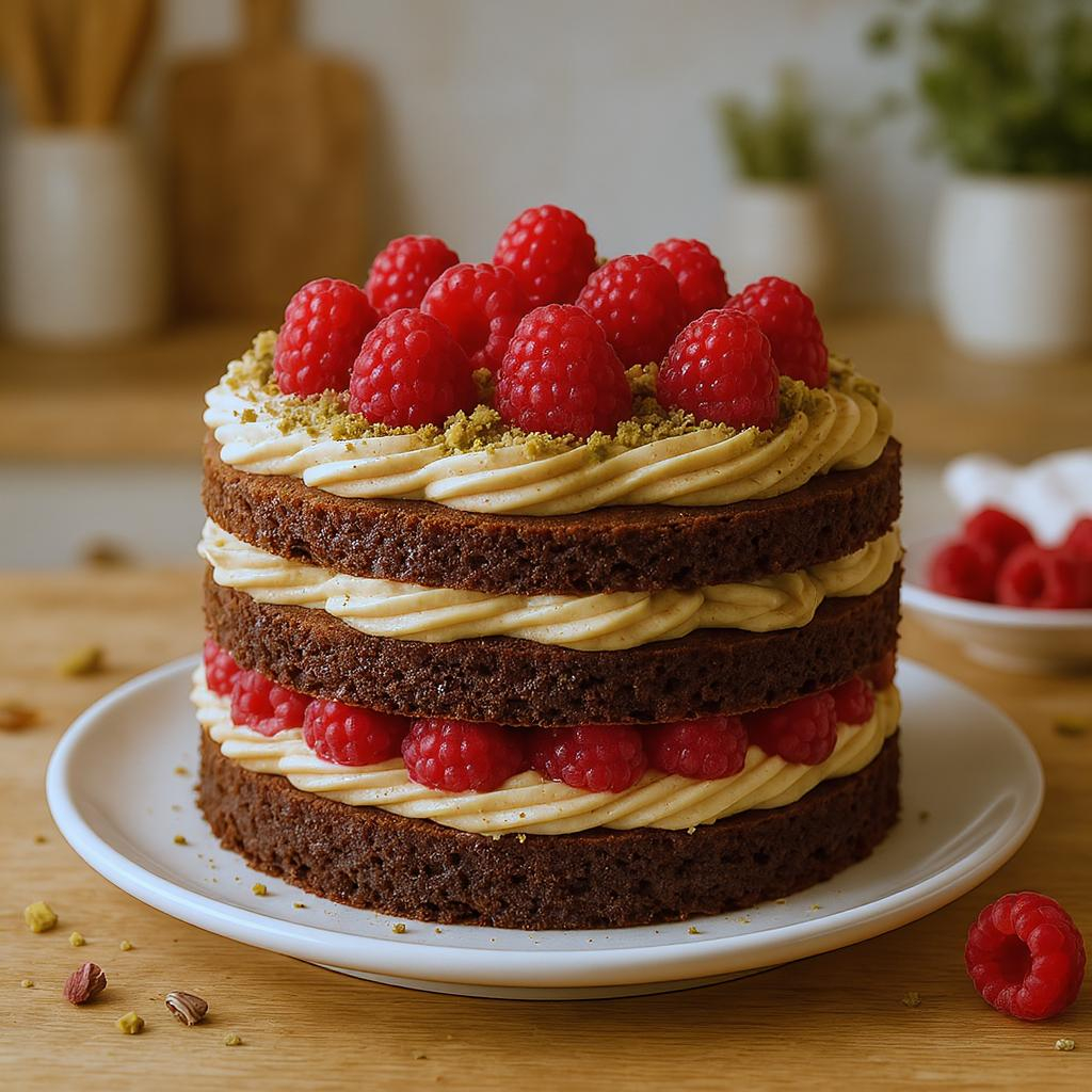 Una torta al cioccolato a tre strati, pensata per il cake design, che unisce una base intensa e soffice al cacao a una crema al pistacchio vellutata e a lamponi freschi leggermente aciduli.